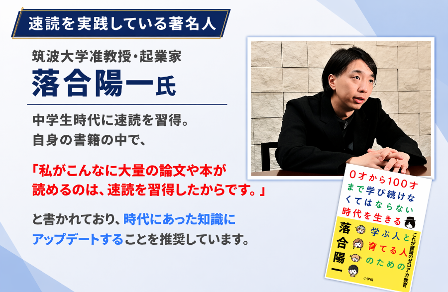 筑波大学准教授の落合陽一氏は中学生時代に速読を習得しており、自身の著書の中でこう述べています。「私がこんなに大量の論文や本が読めるのは、速読を習得したからです。」