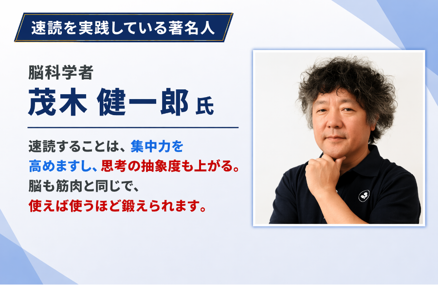 脳科学者の茂木健一郎氏は「速読することは、集中力を高めますし、思考の抽象度も上がる。脳も筋肉と同じで、使えば使うほど鍛えられます」と語ります。